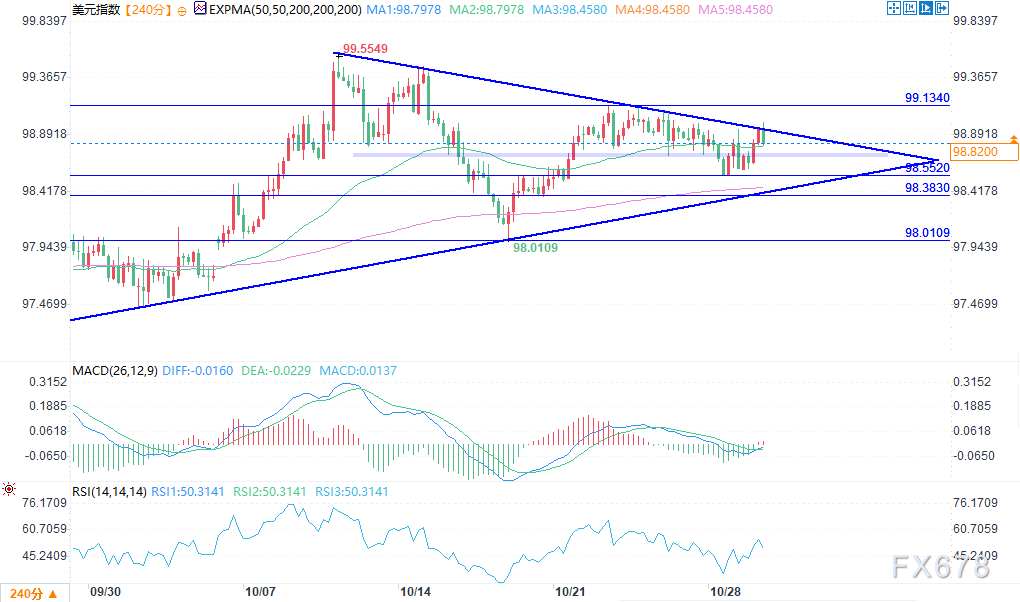 汇通财经APP讯——周三(10月29日)欧盘时段,美元指数(DXY)目前交投于98.858附近,价格先抑后扬,早盘一度下探至约 98.62 附近,随后展开反弹,午后冲高至接近 99.00的日内高点,目前有所回落但仍保持在相对高位。