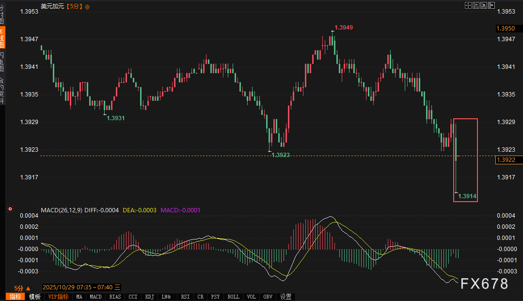 汇通财经APP讯——周三(10月29日),欧洲时段美元兑加元交投1.3950下方,小时图显示汇价自1.4037高点回落,近期长实体阴线击穿1.3958后,围绕1.3930—1.3940窄幅震荡。今晚2...