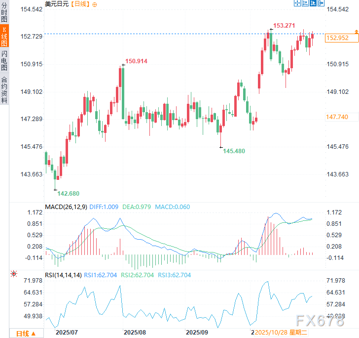 汇通财经APP讯——日元周四(10月30日)盘中遭遇部分抛压,此前日本央行决定维持现行政策不变,但跌势并未持续扩大。美元兑日元一度显著拉升,随后于153关口附近震荡。市场似乎不愿大举建仓,而是选择观望更多关于12月或明年初加息的线索——市场普遍预期日本新任首相高市早苗将推行激进的财政支出计划。