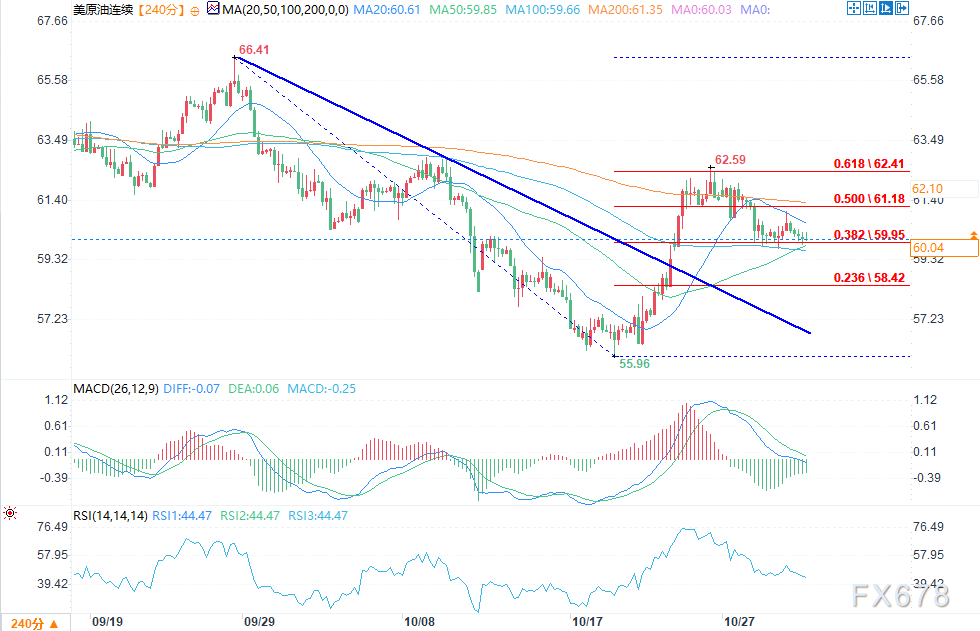 汇通财经APP讯——周四(10月30日),WTI原油期货小幅走低,价格未能延续周三的小幅反弹,价格在关键技术阻力位下方停滞。50日均线为59.85美元,继续限制上行势头,最近的波动高点为62.59美元。