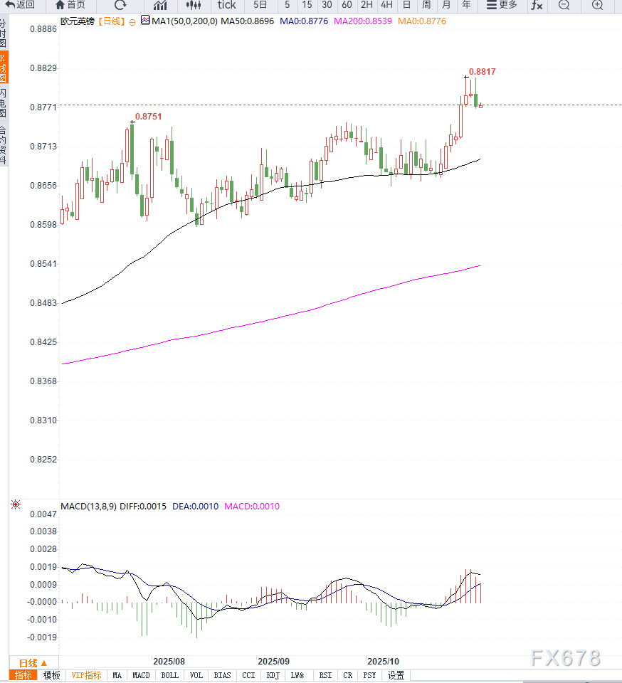 汇通财经APP讯——欧元兑英镑周一于欧洲早盘延续上行趋势,交易价格维持在0.8775附近。市场情绪受到英国国内政治与财政不确定性影响,英镑承压下滑。