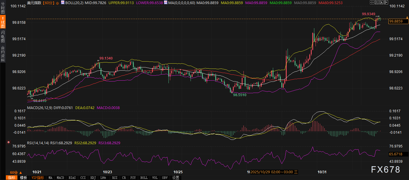 汇通财经APP讯——周一 (11月03日),美元指数在亚洲和欧洲交易时段呈现出温和反弹的态势,现货价格在关键的技术阻力位附近窄幅波动。截至本文撰写时,美元指数报价为 99.8739,日内小幅上涨 0.17%,显示出市场在等待进一步指引前的谨慎买盘情绪。尽管技术面短线有所支撑,但基本面却受到美国国内经济和政策不确定性的挑战,这种基本面与技术面短期分化的格局,成为当前盘面的主要特征。