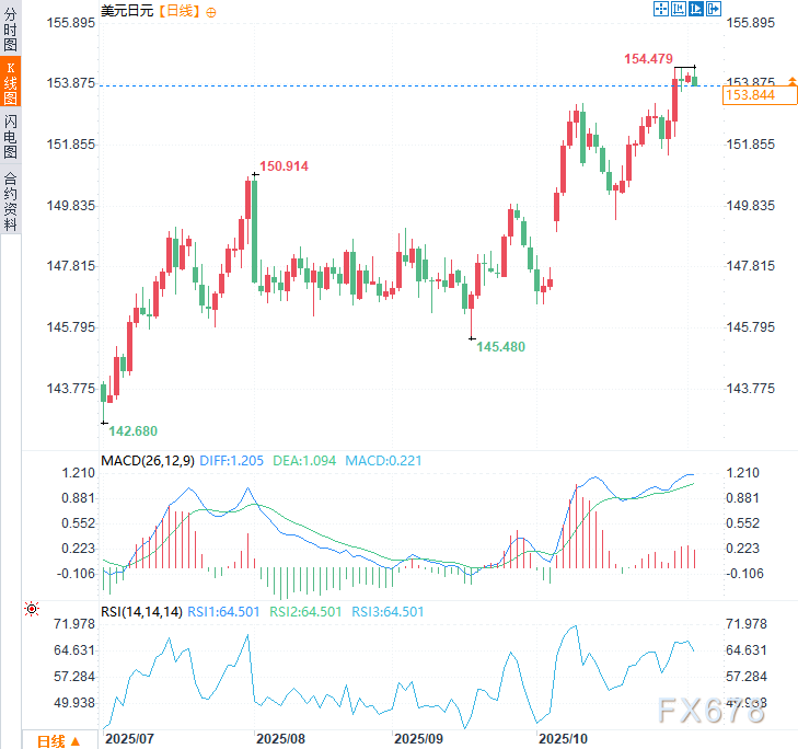 汇通财经APP讯——周二(11月4日)美元兑日元一度触及10月30日创下的2月以来的高点(154.48),而后受到逢高卖出承压小幅下行,跌幅约0.30%,现交投于153.75附近。