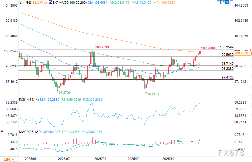 汇通财经APP讯——周二(11月4日),美元指数升至三个月高点,在略微回落之前达到100.215。这是自8月初以来首次突破心理关口100,但未能超过8月1日的高点100.257。下一个主要技术阻力是200日移动均线100.421,这一水平可能会决定当前五日反弹的方向。