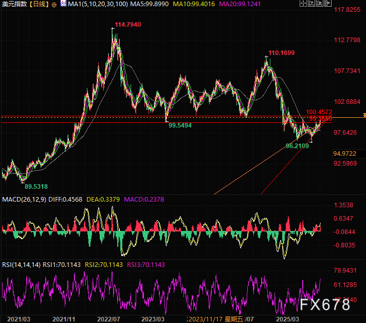 汇通财经APP讯——周三(11月5日),美元指数欧洲时段于100.10上方交投,波动幅度不大。盘面显示,自9月以来的上升通道仍在发挥牵引作用,价格仍靠近前高100.2200一线。今日焦点在就业数据与利...