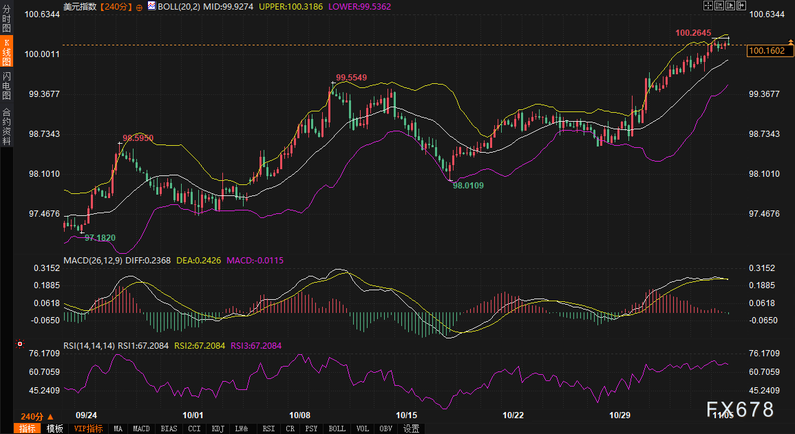 汇通财经APP讯——周三(11月5日),美元指数欧洲时段于100.10上方交投,波动幅度不大。盘面显示,自9月以来的上升通道仍在发挥牵引作用,价格仍靠近前高100.2200一线。今日焦点在就业数据与利...