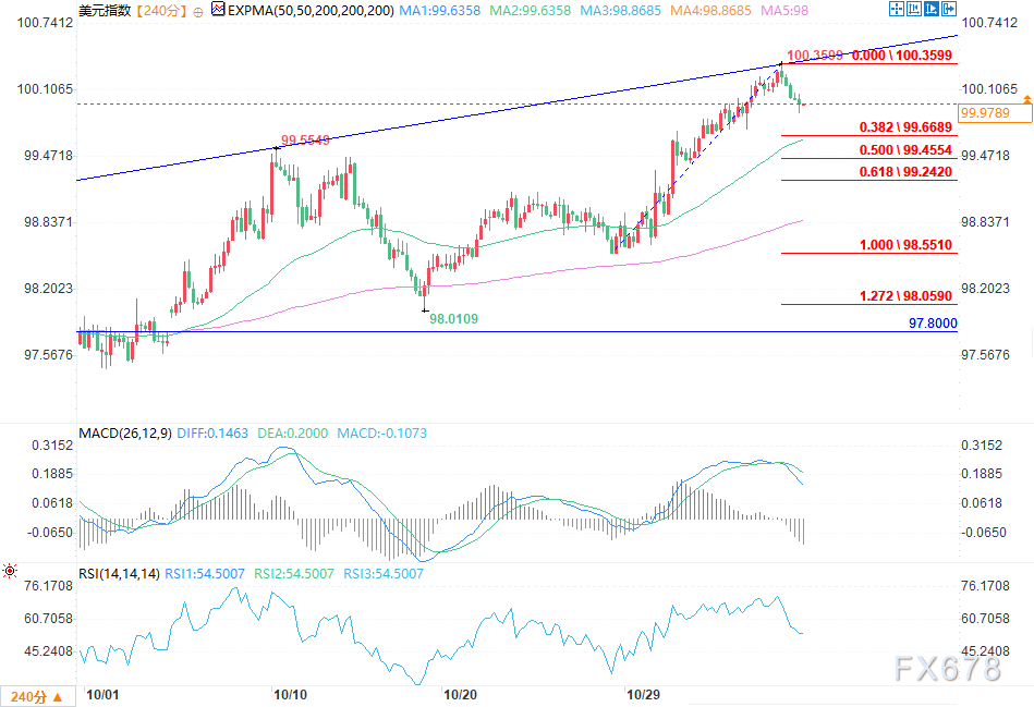 汇通财经APP讯——周四(11月6日)欧盘时段,美元指数(DXY)目前交投于99.95附近,在周三波动行情后小幅回落。随着交易员消化美国喜忧参半的经济数据,美元从近期高点回落,投资者则将注意力转向主要央行会议。