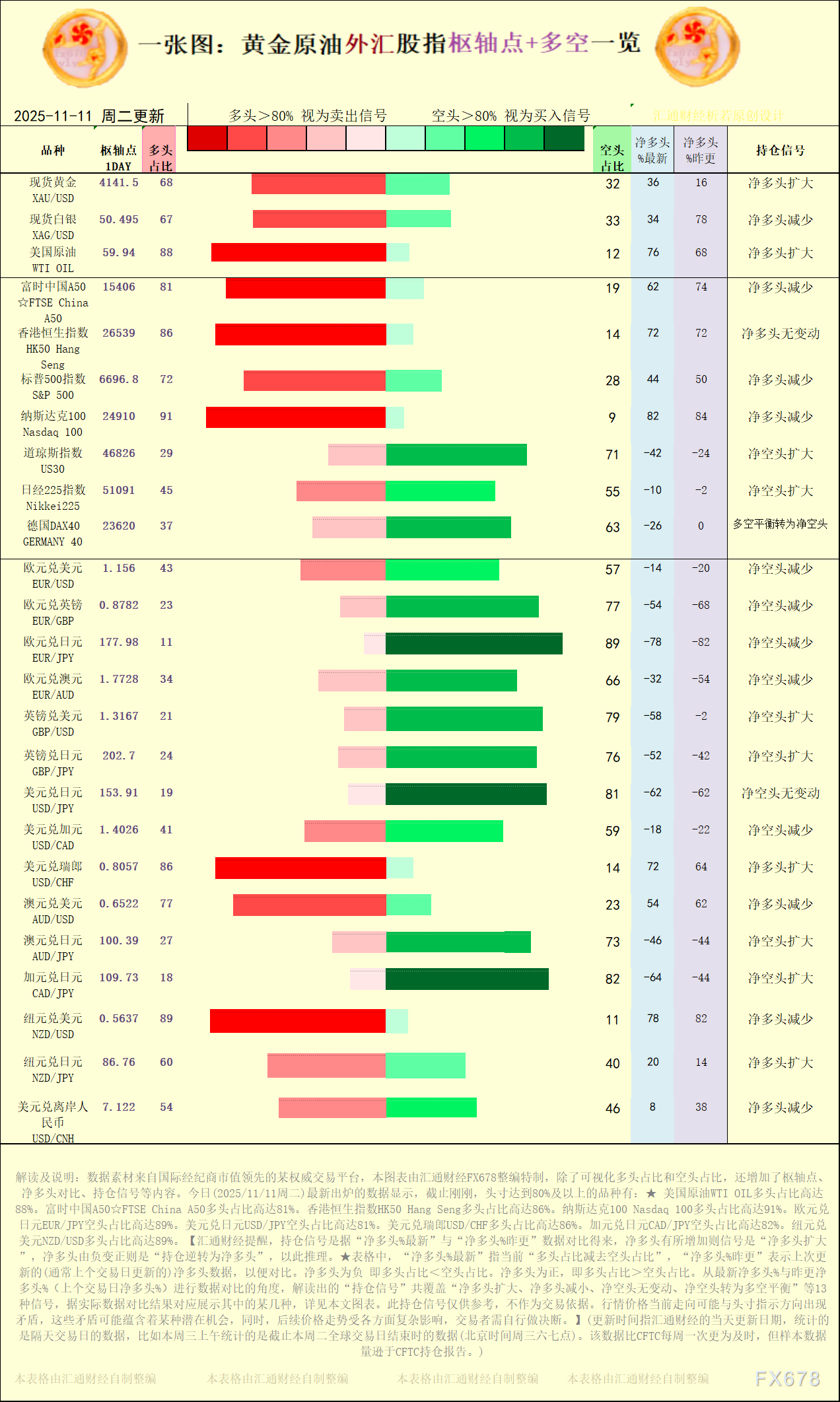 汇通财经APP讯——以下是一张图系列之最新黄金原油外汇股指“枢纽点+多空持仓信号”一览,含图表解读及文字解读。从最新净多头%与昨更净多头%(上个交易日净多头%)进行数据对比的角度,解读出的各类持仓信号...