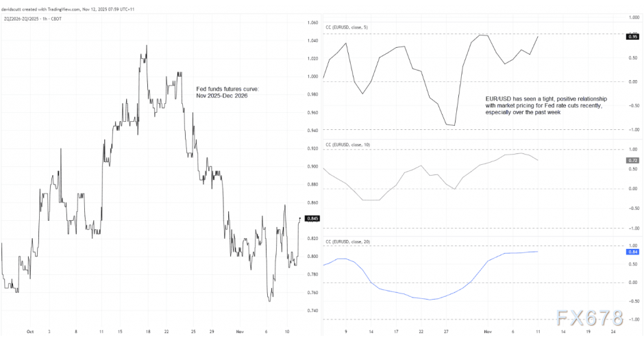 汇通财经APP讯——欧元/美元与美联储利率预期高度关联,相关性接近极端水平。由于美国数据流仍然受限,且两大央行均处于观望模式,该货币对可能在重要数据发布前维持盘整走势。周三(11月12日),欧元/美元于1.1575附近窄幅震荡,此前该货币对连续五个交易日走强。