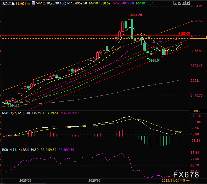 汇通财经APP讯——现货黄金在周三(11月12日)亚洲时段徘徊于三周高位下方小幅承压,目前交投于4106.24美元/盎司附近,跌幅约0.5%,多头在定位进一步升值之前等待突破4150-4155美元的水...