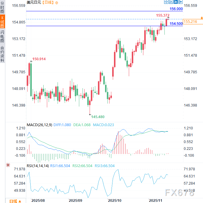 汇通财经APP讯——美元兑日元周二(11月18日)亚市时段震荡走高,延续前一交易日涨势,一度达9个月以来新高155.37,而后小幅回落,现交投于155.20附近。有报道称日本首相高市早苗计划通过减税刺激消费,此举加剧了市场对政府长期财政健康的担忧。