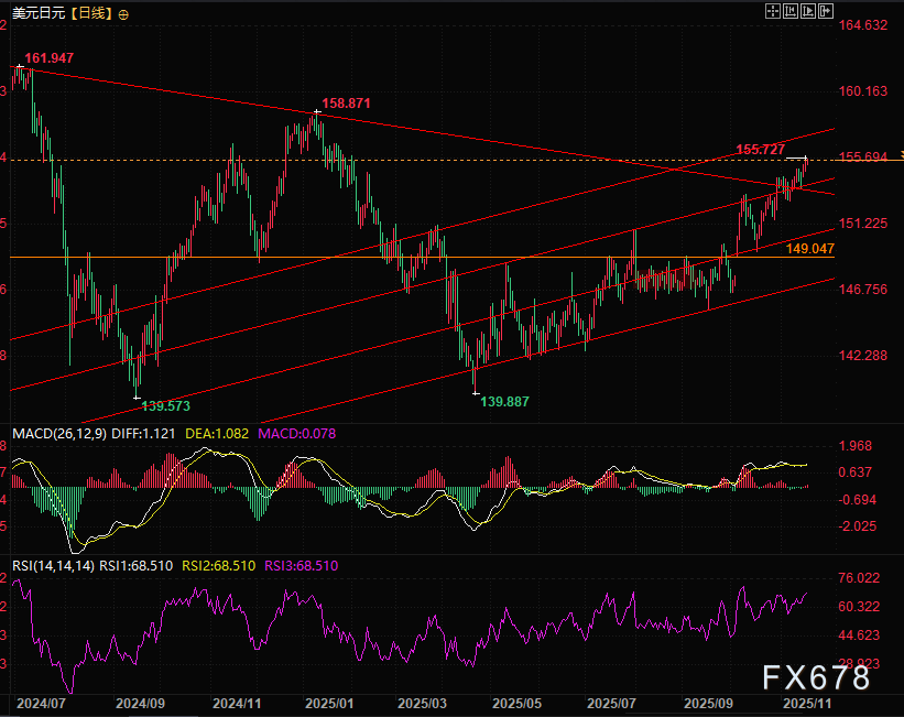 汇通财经APP讯——周三(11月19日)亚欧时段美元兑日元继续震荡上行,日元继续值走贬,目前交投于155.59附近。