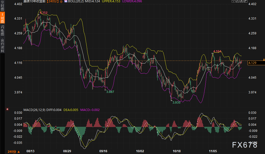汇通财经APP讯——周三(11月19日),美债收益率整体小幅上行,10年期美债收益率报4.139%,日内涨0.36%;美元指数报99.7669,日内微涨0.17%;现货黄金在避险情绪支撑下表现强劲,最新报4111.93美元/盎司,日内涨幅扩大至1.10%。市场关注今晚美联储10月会议纪要和明日延迟发布的9月非农就业数据,同时特朗普关税言论持续带来不确定性,债市、汇市与黄金走势高度联动。