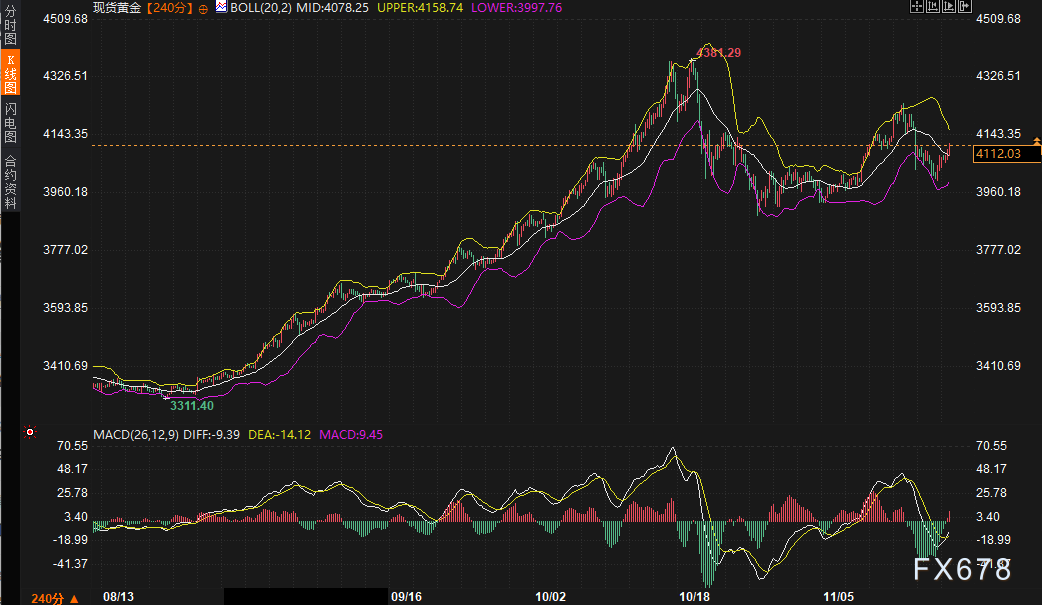 汇通财经APP讯——11月19日,星期三。当前全球金融市场整体情绪偏向规避风险,科技股估值压力与宏观数据不确定性交织,使避险资产重新受到关注。在这样的背景下,现货黄金价格北美时段运行在4100美元上方...