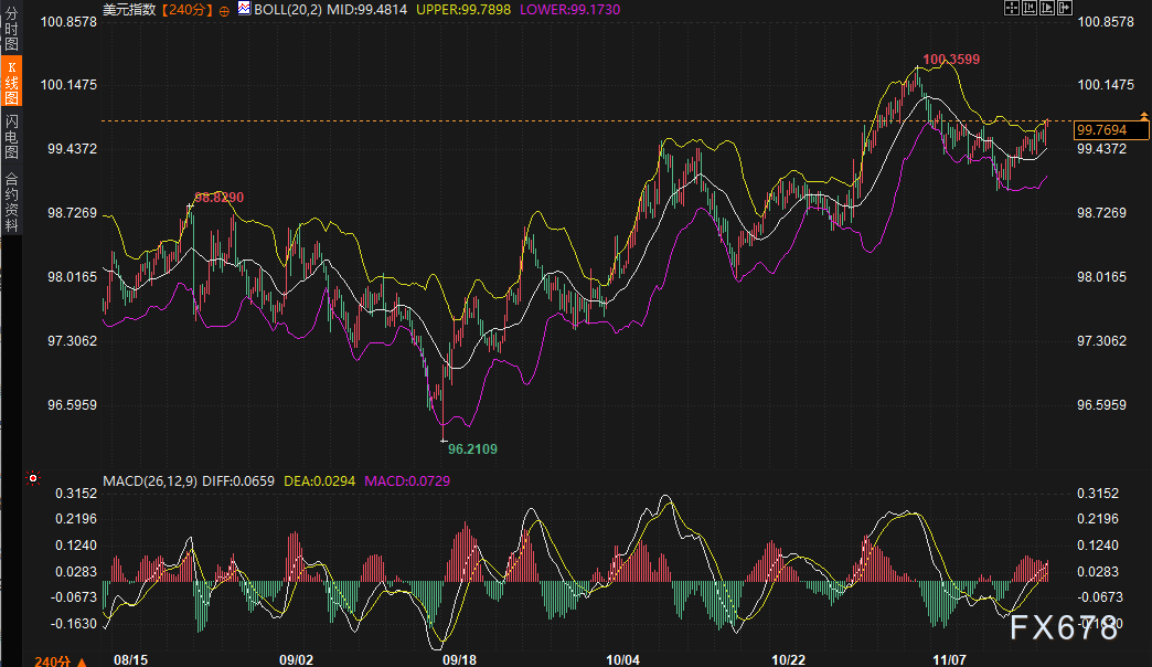 汇通财经APP讯——周三(11月19日)欧洲早盘,美元指数小幅走高0.16%至99.74附近。从分时图来看,美元指数呈现先抑后扬的强势反弹走势,整体多头动能在午后时段集中释放。 src=http://...