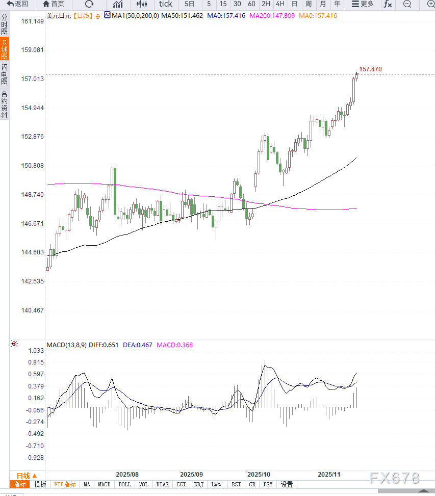 汇通财经APP讯——周四(11月20日)美元兑日元一度上涨0.18%,刷新逾十个月高点达157.42,延续前三个交易日涨势。前一交易日美元兑日元录得约1.08%的涨幅,收报157.13,超越过去五个交...