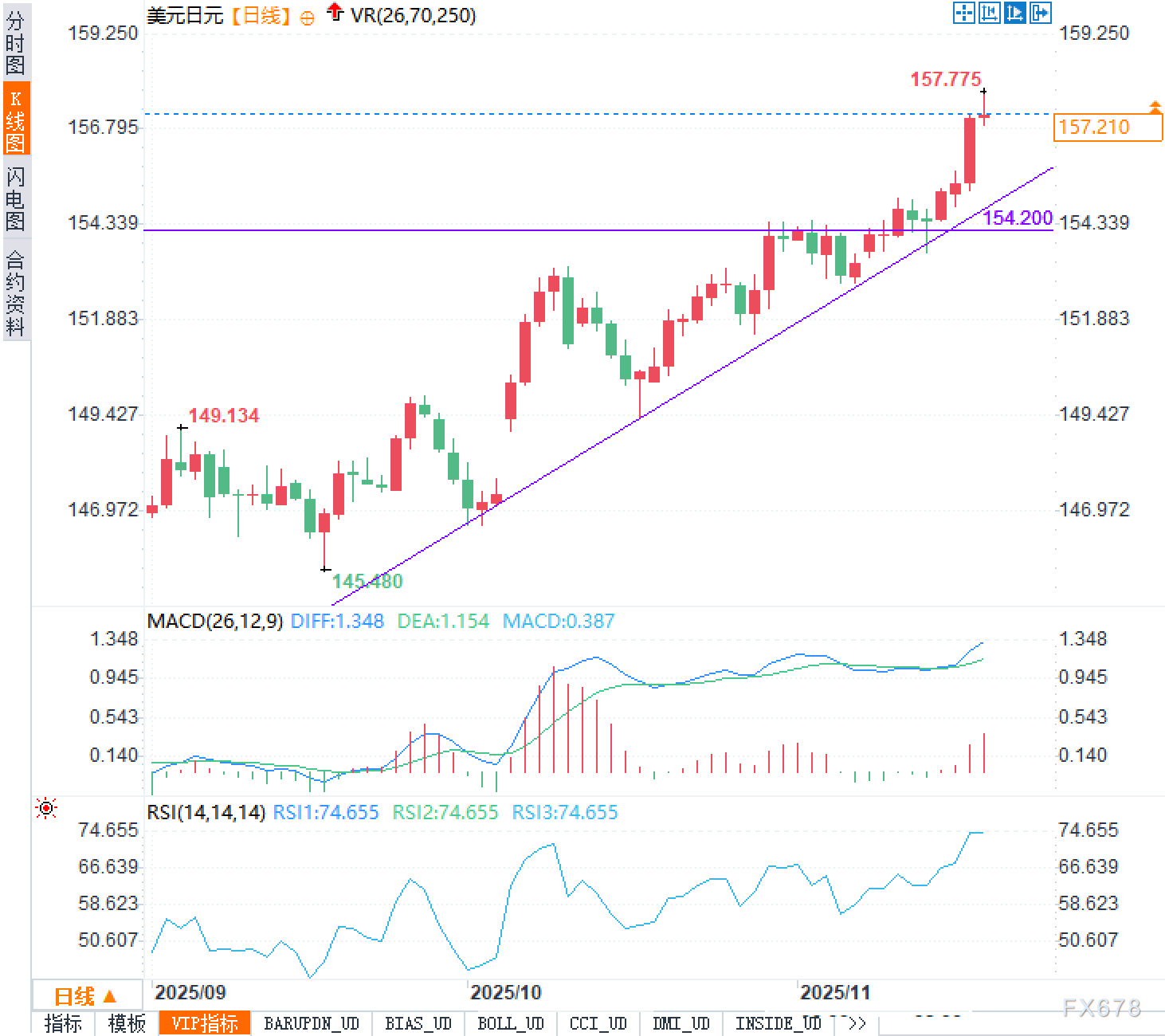 汇通财经APP讯——11月20日,星期四。当前外汇市场的关注点,正集中在美元利率预期再定价、美国延期公布的非农就业数据,以及日本财政与货币政策组合的再平衡之上。在这样的宏观背景下,美元兑日元本周延续突破走势,连续第四个交易日上行,最高一度逼近157.75–157.80区间,目前欧洲时段回落至157.20附近窄幅整理。