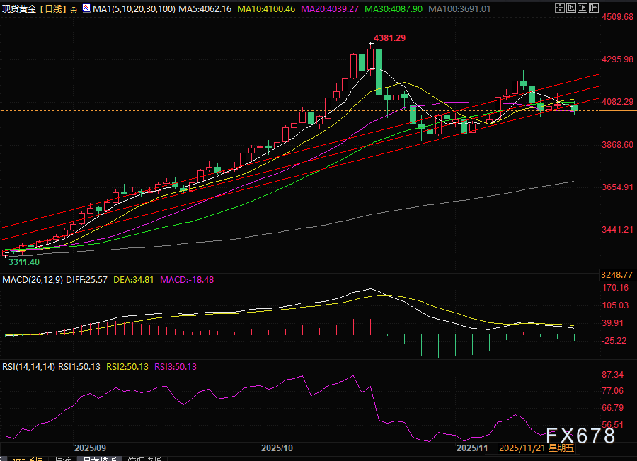 汇通财经APP讯——周五(11月21日)现货黄金震荡下行,跌约0.60%至每盎司4050美元附近。前一交易日现货黄金剧烈震荡,最终稳收报4077.17美元/盎司,周四最高冲至4110.03美元,最低跌...