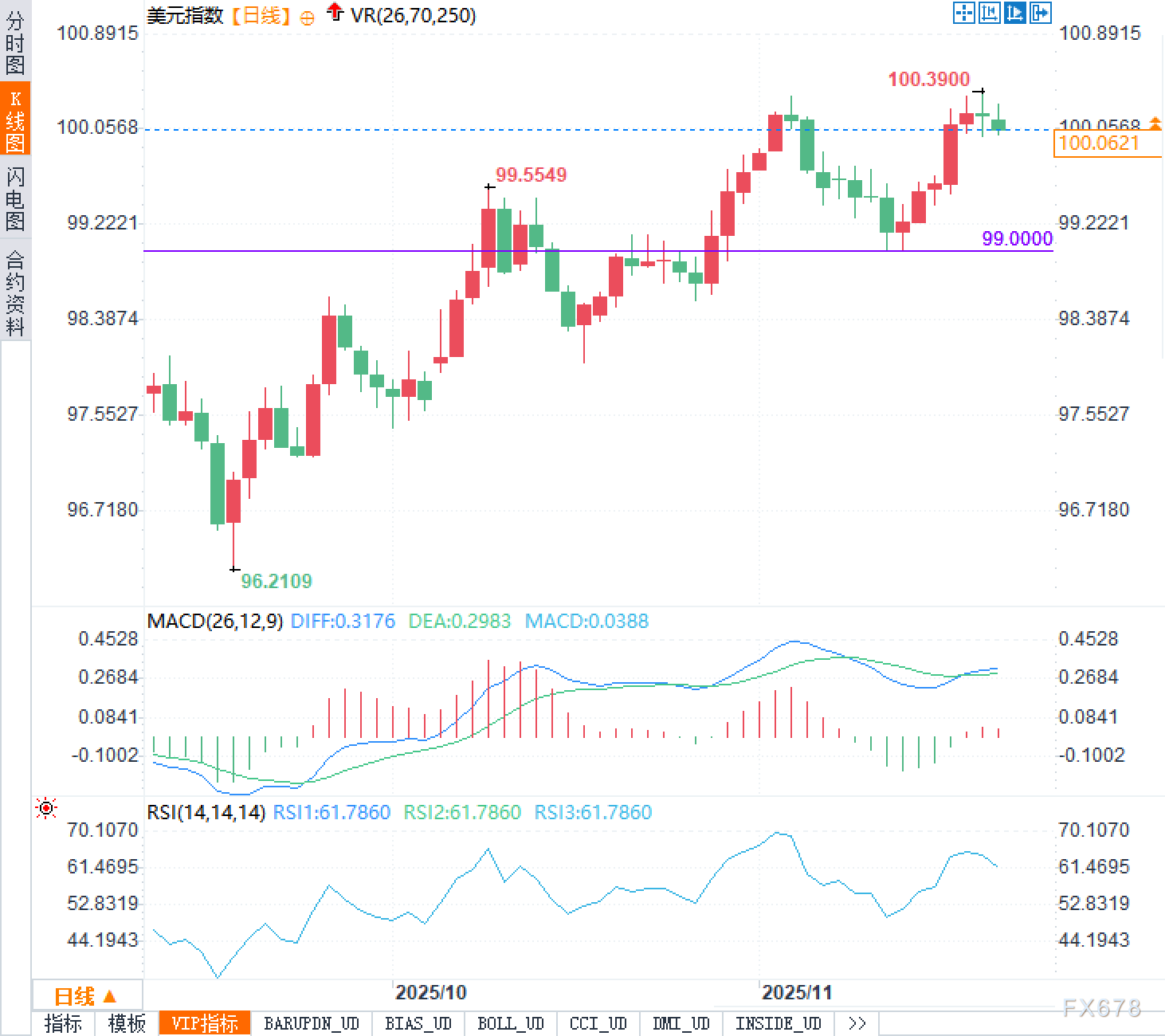 汇通财经APP讯——11月24日,星期一。美元指数北美时段交投于100关口略微上方,处于近期震荡区间的中轴位置。尽管美联储多位官员相继释放鸽派信号,推动市场对12月降息的预期升温,但美元并未出现显著走弱,反而在部分时段表现出韧性。