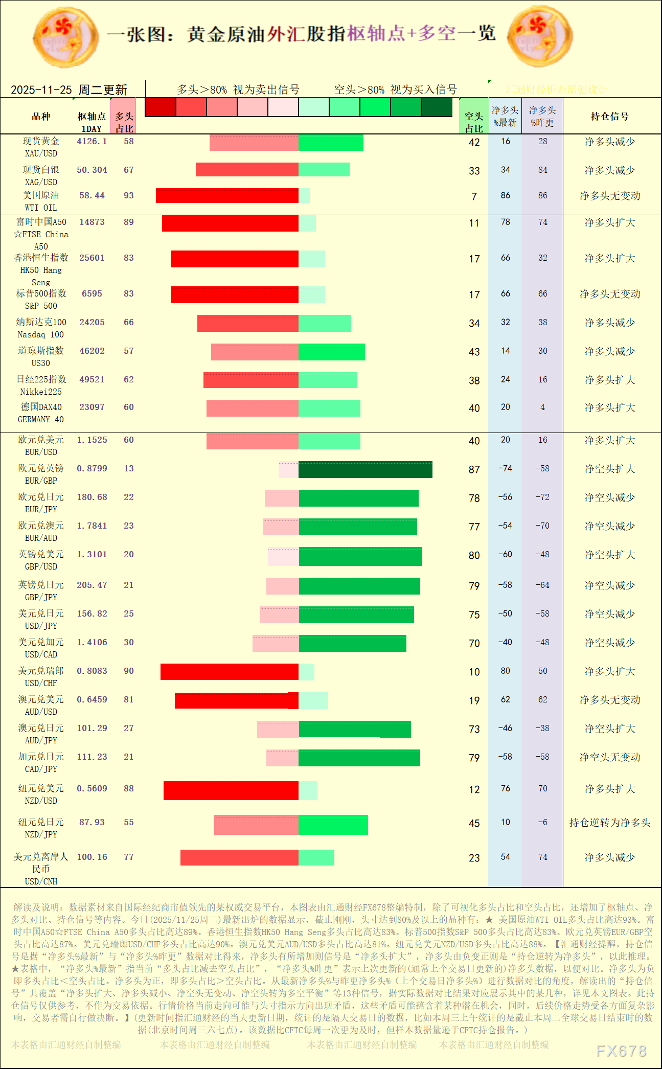 汇通财经APP讯——以下是一张图系列之最新黄金原油外汇股指“枢纽点+多空持仓信号”一览,含图表解读及文字解读。从最新净多头%与昨更净多头%(上个交易日净多头%)进行数据对比的角度,解读出的各类持仓信号...