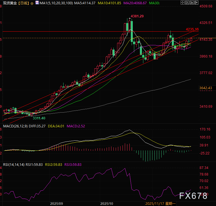 汇通财经APP讯——周三(11月26日)亚欧时段,现货黄金与亚洲股市一起继续走强,目前交投于4160附近,涨0.73%。交易员计入12月美联储降息84%的概率,同时美元指数大幅调整,使得黄金买盘持续涌入,推动黄金价格攀升至两周高位,成为贵金属市场的核心领涨品种。