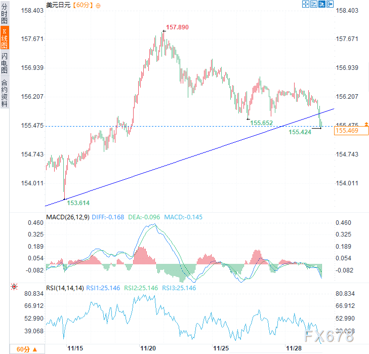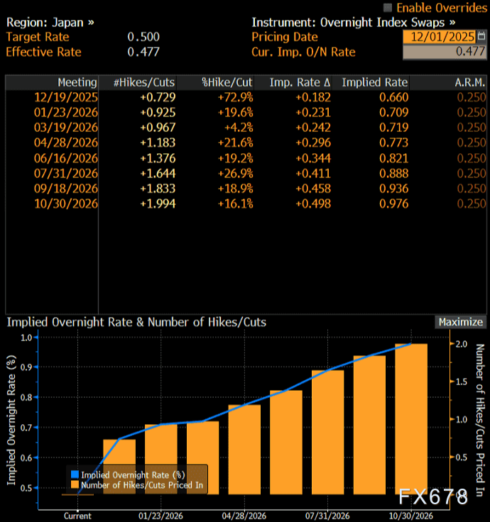 市场反应剧烈:利率互换市场显示12月加息概率升至73%,日本国债收益率曲线呈熊市扁平化变动,美元兑日元跌破10月以来的上升趋势,延续了前两个交易日的跌势,跌幅约0.44%。