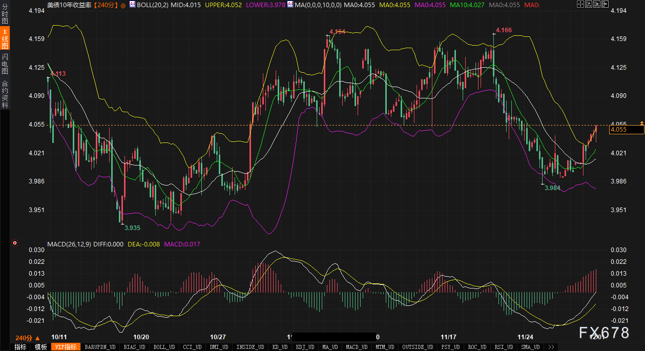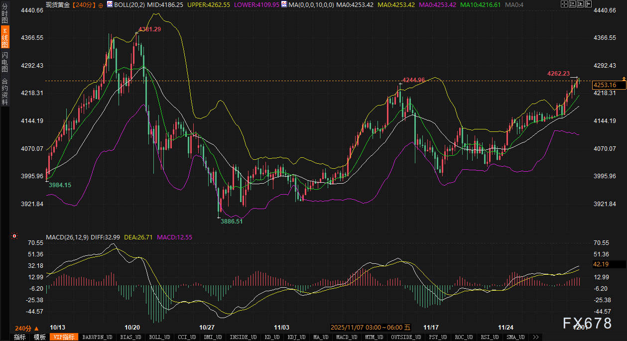 汇通财经APP讯——周一(12月1日),全球金融市场经历了由亚太时段发起、向欧美市场传导的显著波动。其核心驱动力源于日本央行行长植田和男发表的超预期鹰派言论,该言论大幅提升了市场对日本央行在12月加息的预期。此举引发日本国债(JGB)遭遇抛售,收益率急剧攀升至多年高位,并推动日元大幅走强。这一连锁反应迅速波及全球债券市场与汇率市场:10年期美债收益率自近期低点反弹,日内上涨0.52%,报4.045%;美元指数则承压下挫,日内跌幅达0.49%,一度触及99.24,刷新了自11月17日以来的低点。在此背景下,现货黄金展现出强劲的避险与资产轮动吸引力,价格突破前期关键阻力,日内上涨0.81%,报4253.83美元/盎司,创下自10月21日以来的新高。整体市场呈现出“债市抛售-日元升-美元弱-黄金强”的典型跨市场联动格局。