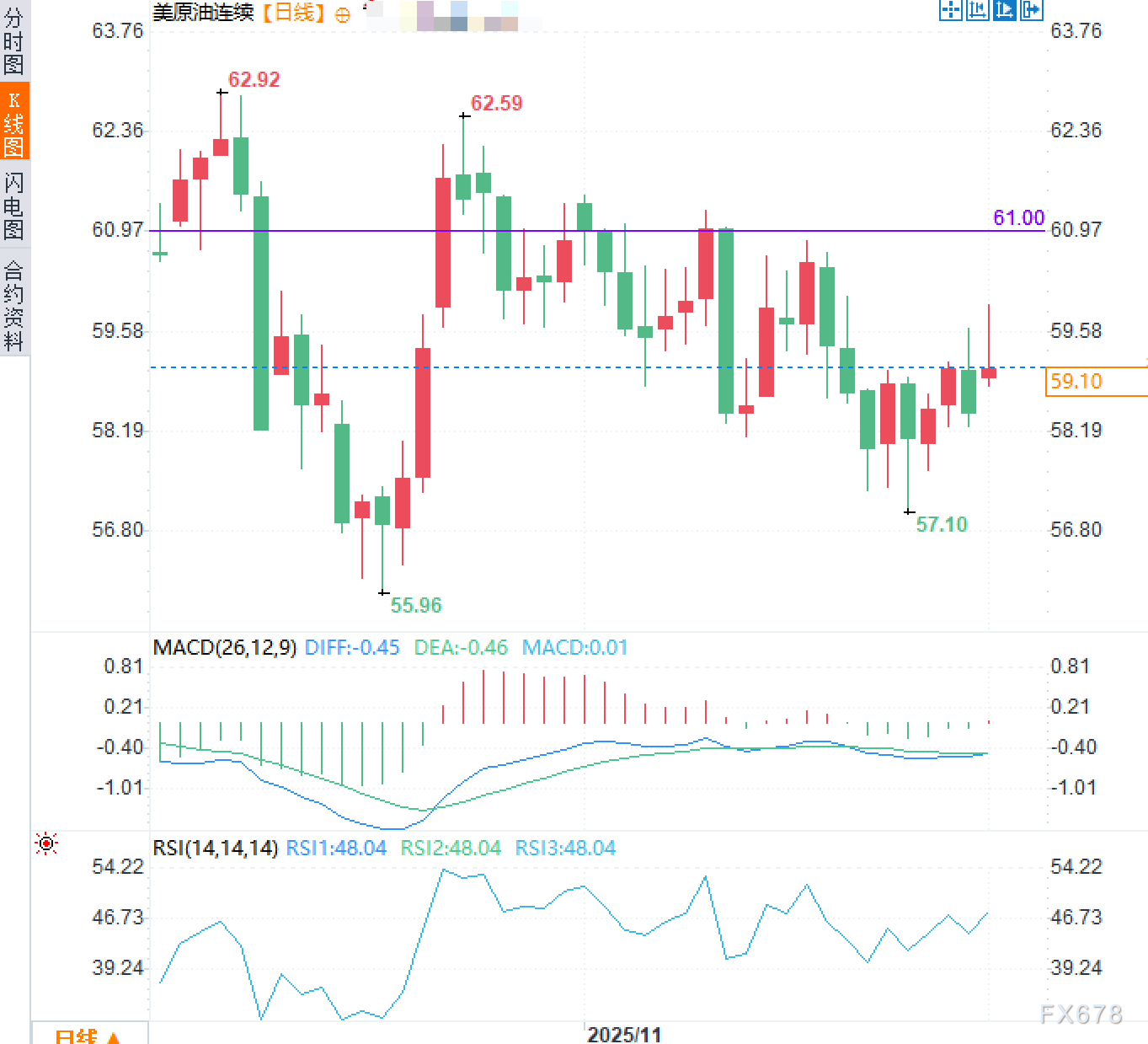 汇通财经APP讯——12月1日,星期一。当前国际能源市场在多重地缘政治风险与宏观政策预期交织下呈现震荡偏强格局。北美时段美原油价格交投于每桶59美元附近,较前一交易日小幅走高。近期走势主要受到俄罗斯能源基础设施再遭袭击、委内瑞拉原油出口面临潜在中断风险以及OPEC+维持产量政策不变等供给侧因素推动。