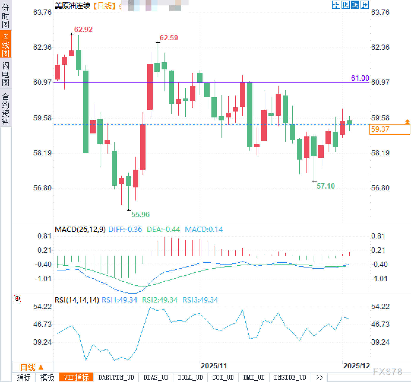 汇通财经APP讯——周二(12月2日),美原油延续近期震荡格局,欧洲时段盘中价格围绕59.40美元窄幅波动。美元指数走强对油价形成压制,市场正等待美国石油学会(API)将公布的周度库存报告以寻求进一步方向指引。地缘政治扰动与供应端变数交织,令原油市场陷入多空拉锯的胶着状态。