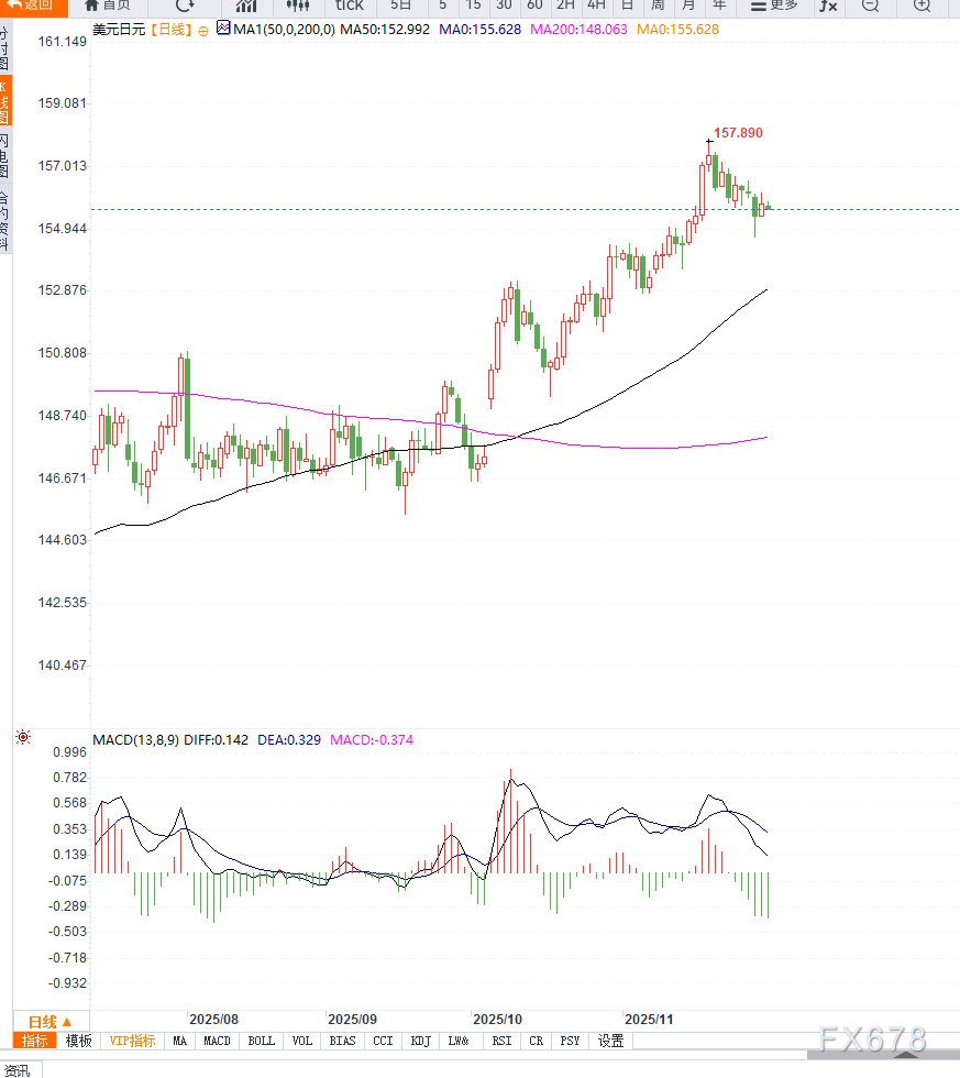 汇通财经APP讯——周三亚洲交易时段,美元兑日元尝试延续前一日上破156.00的反弹,但未能站稳高位,并回落至155.65附近。尽管汇价有所回调,但缺乏明显的跟进抛售,反映市场在重要数据公布前保持谨慎。