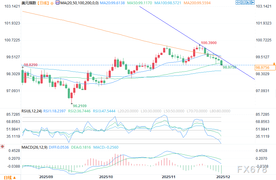 汇通财经APP讯——周三(12月3日)欧洲时段,美元指数延续跌势,向99一线靠拢,创下逾两周新低。此次持续下行反映出市场对美联储下周启动降息周期的坚定预期,CME美联储观察工具显示,当前市场对25个基...