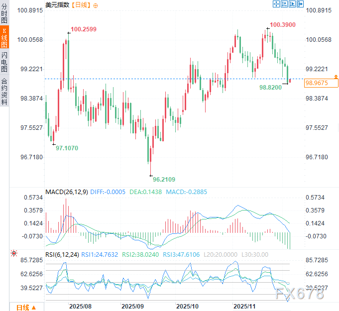 汇通财经APP讯——周三(12月3日)欧盘时段,美元指数遭遇显著抛压,空头趋势清晰可见。指数跌破50日均线关键支撑位99.117后,该水平已转化为新的阻力位;随后进一步失守98.991的震荡低点,进一...