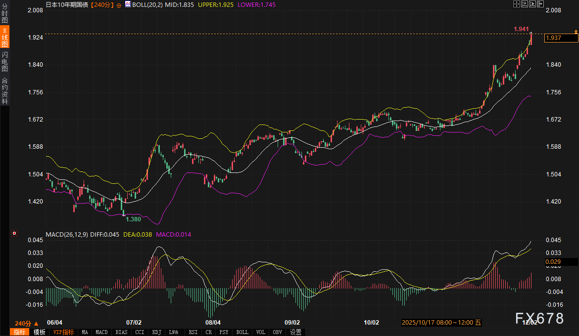 汇通财经APP讯——周四(12月4日)亚洲及欧洲交易时段, 日本金融市场成为全球焦点。美元兑日元汇率在155关口附近震荡承压,240分钟图显示价格运行于关键均线下方,当前报于154.889附近。与此同时,日本国债市场经历了一场剧烈的多空博弈,十年期国债收益率一度飙升至1.935%,创下2007年7月以来的新高,最终收于1.935%,全日上行4.5个基点。市场异动的核心驱动力,源于一则关于日本央行与政府关系的深度报道,该报道几乎确定了十二月加息的议程,并将政策制定者面临的长期沟通困境置于台前。