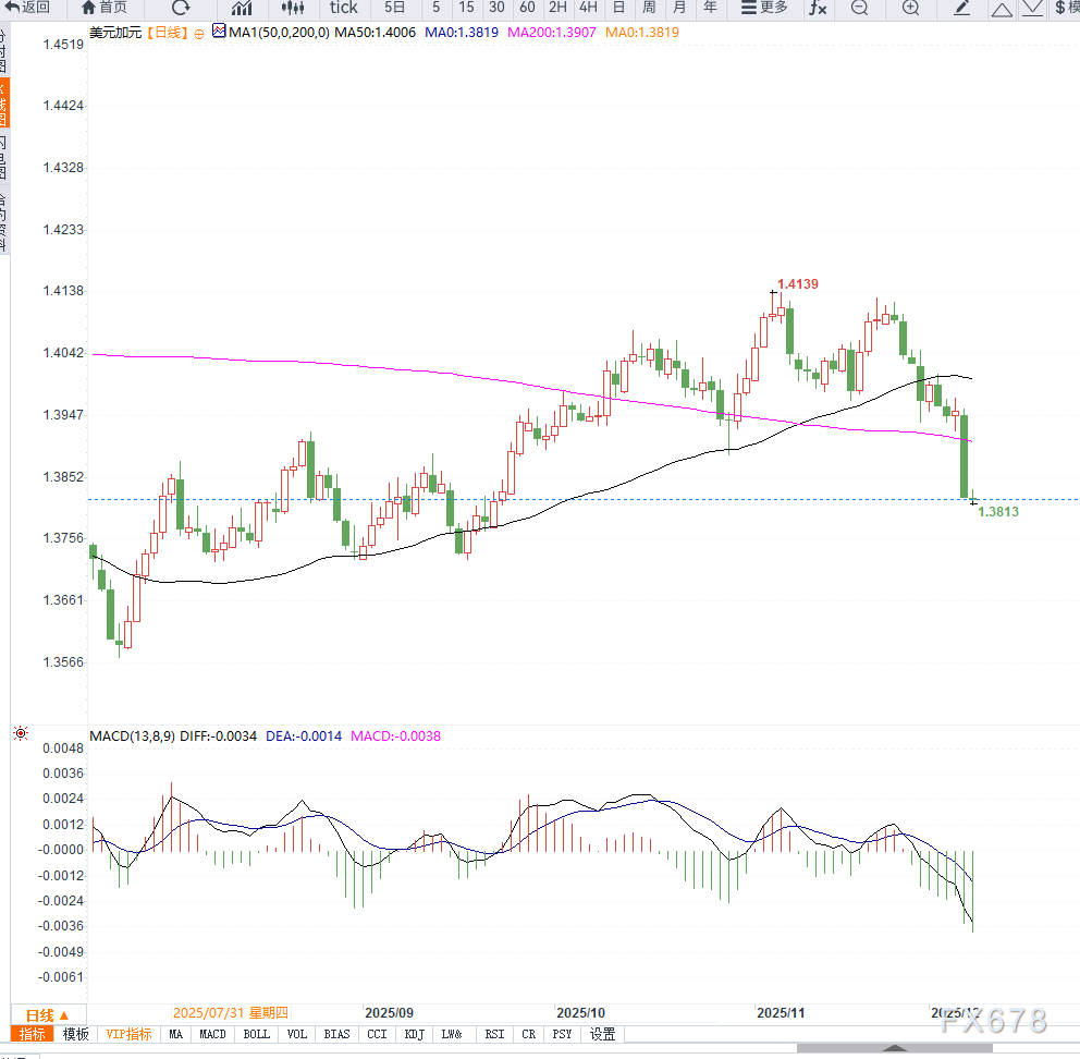 汇通财经APP讯——美元兑加元(USD/CAD)周一亚洲时段交投疲软,维持在约1.3800的11周低位附近。上周五,加元大幅走强,主要受到加拿大11月劳动力市场数据优于预期的推动。