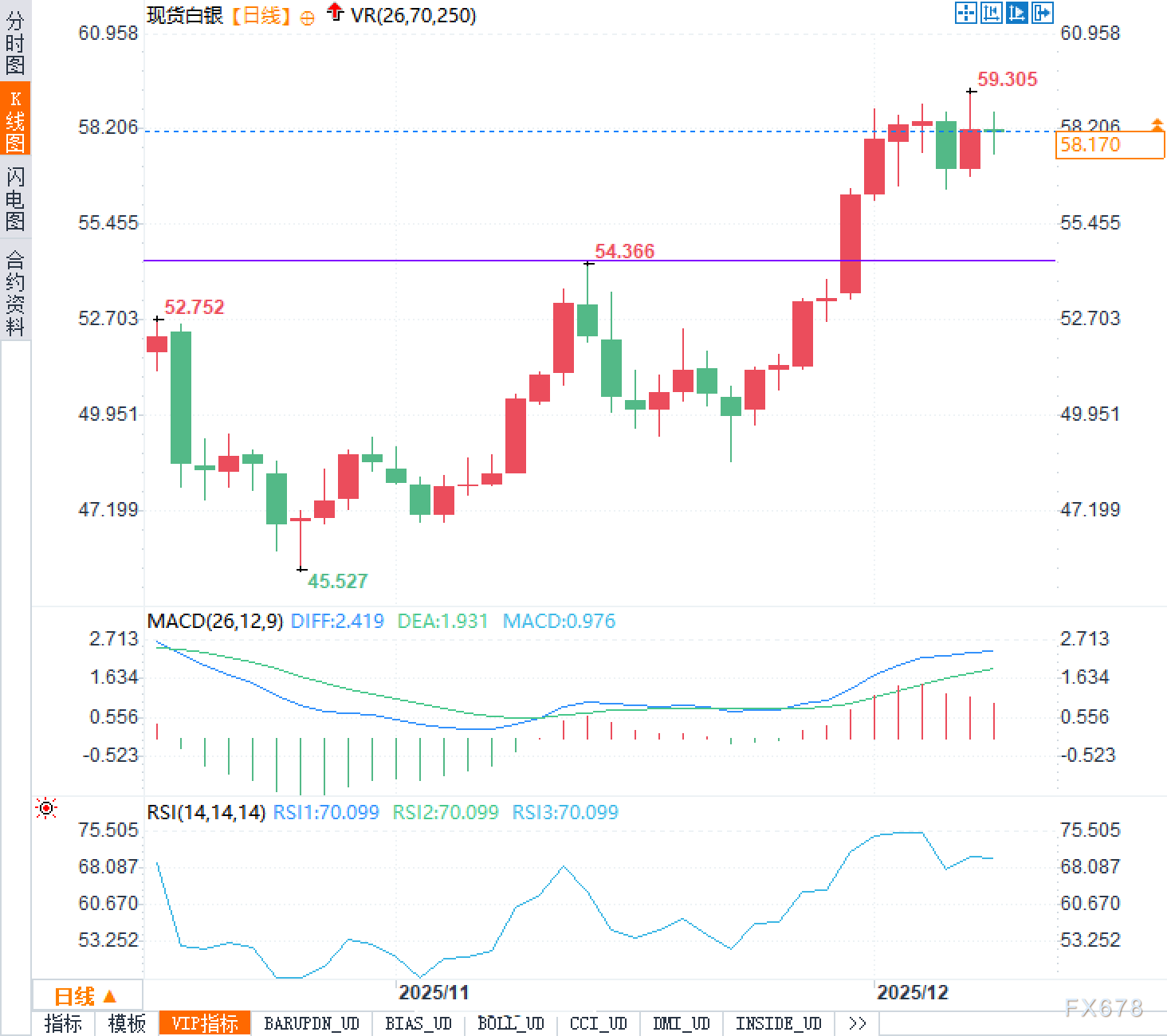 汇通财经APP讯——12月8日,星期一。现货白银价格北美时段维持窄幅震荡格局,报于每盎司58.20美元附近,整体走势延续此前数个交易日的盘整态势。市场情绪以谨慎为主导,交易员普遍选择观望策略,等待本周美联储货币政策会议结果出炉,以进一步判断未来全球流动性环境的演变路径。