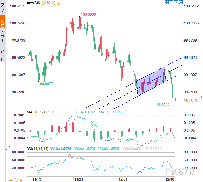 真正引发市场波动的是鲍威尔在新闻发布会上的言论,与此前9月和10月的降息不同,此次降息后美元反而遭遇抛售。周四美元指数延续前一交易日跌势,跌幅约0.05%,一度触及近七周低点98.54,前一交易日跌幅0.59%。
