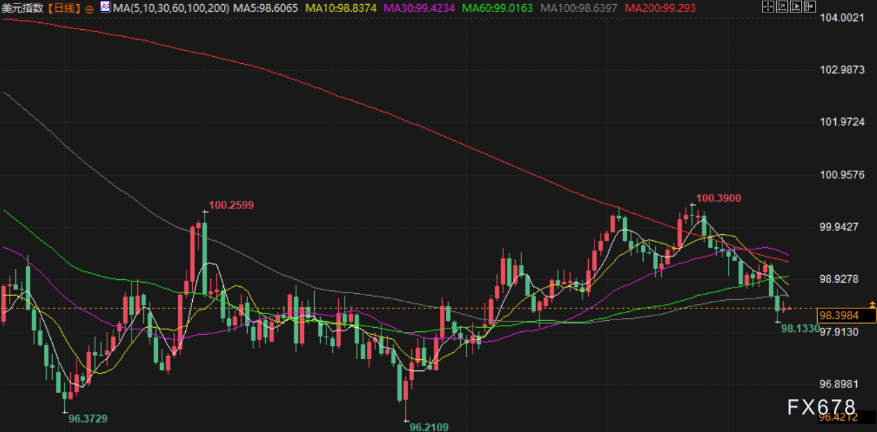 美元指数上周五上涨0.1%,报98.44点,但仍录得连续第三周下跌。与此同时,英镑因英国经济数据表现不佳而走低。
