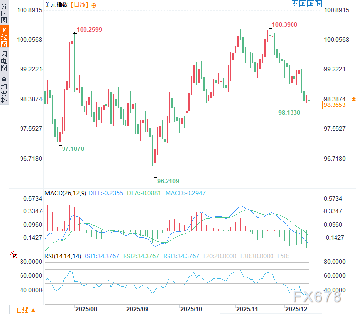 美元指数上周五上涨0.1%,报98.44点,但仍录得连续第三周下跌。与此同时,英镑因英国经济数据表现不佳而走低。 数据显示,英国8至10月国内生产总值意外萎缩0.1%,这巩固了市场对英国央行即将降息的...