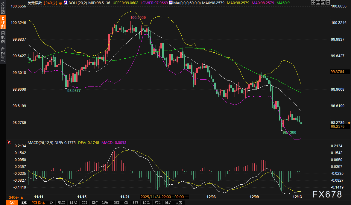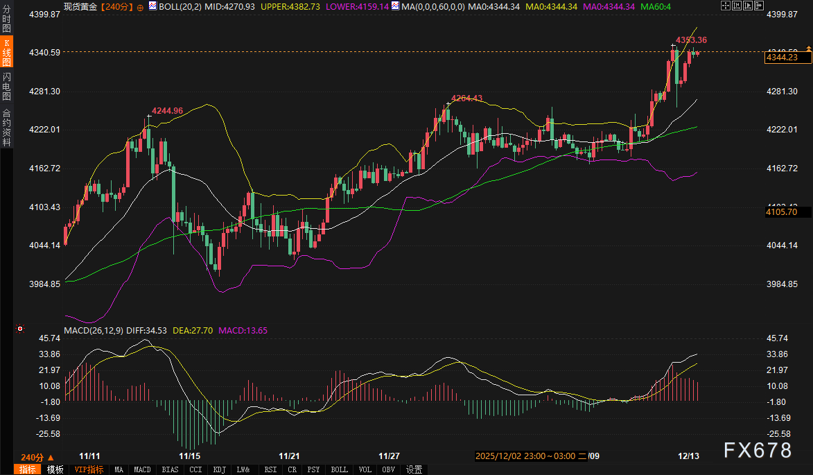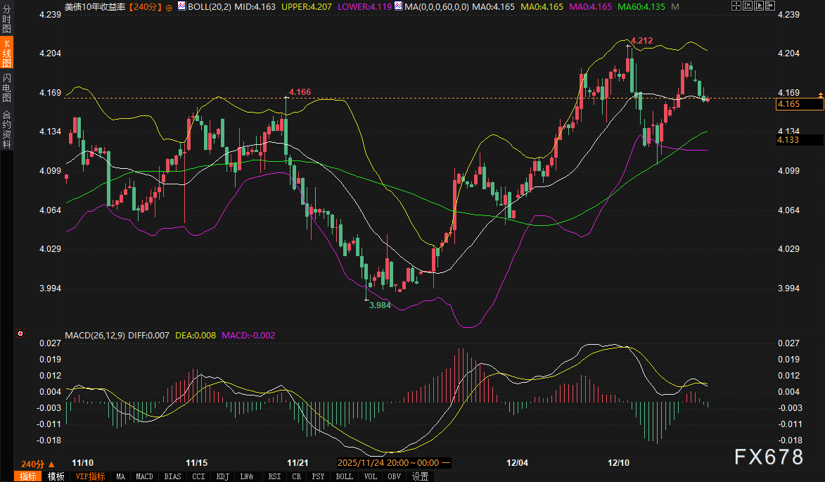 汇通财经APP讯——周一(12月15日) ,全球金融市场进入关键政策周前的谨慎交易模式。美元指数日内微跌0.13%至98.2595,10年期美债收益率下行0.62%至4.165%,现货黄金则显著上涨1.02%至4344.03美元。市场注意力集中于周二即将补发的美国非农就业数据(预期11月新增3.5万人),以及周四欧洲央行、英国央行与周五日本央行的政策会议。尽管欧元区工业产出数据改善提振风险情绪,但投资者在多重事件前选择削减风险敞口,导致美债收益率与美元同步回落,黄金则借助避险资金流入突破关键阻力。