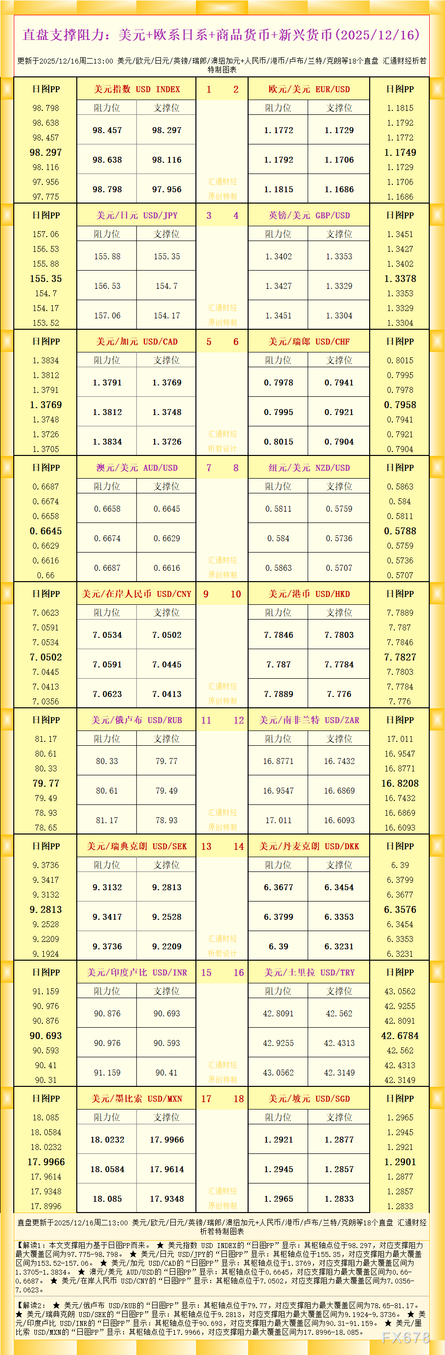 汇通财经APP讯——一张图看直盘支撑阻力:美元+欧系日系+商品货币+新兴货币,更新于2025年12月16日周二13:00,具体美元/欧元/日元/英镑/瑞郎/澳纽加元+人民币/港币/卢布/兰特/克朗等1...