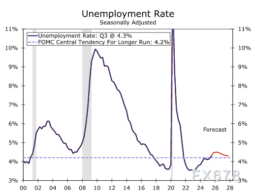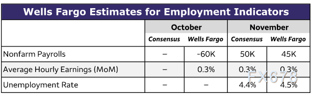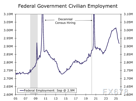 富国银行预估10月非农就业人数减少6万人,但这一数值会夸大就业增长动能的弱化程度,10月是联邦政府延迟辞职计划参与者正式退出薪资名册的首月,叠加政府持续实施的招聘冻结,预计当月联邦就业人数将减少约12.5万人,意思是如果排除政府裁员,非农人数可能呈现正增长6.5万,即看到10月非农就业数据大幅减少不用过度恐慌。