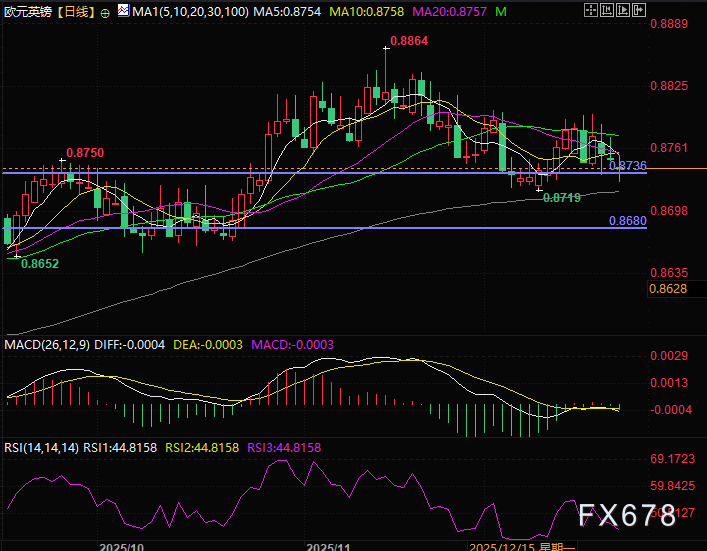 目前该货币对交投于0.8741一线,在触及日内低点0.8728后录得小幅回弹,此位置是重要的颈线位,是双方货币强弱的灵界点。