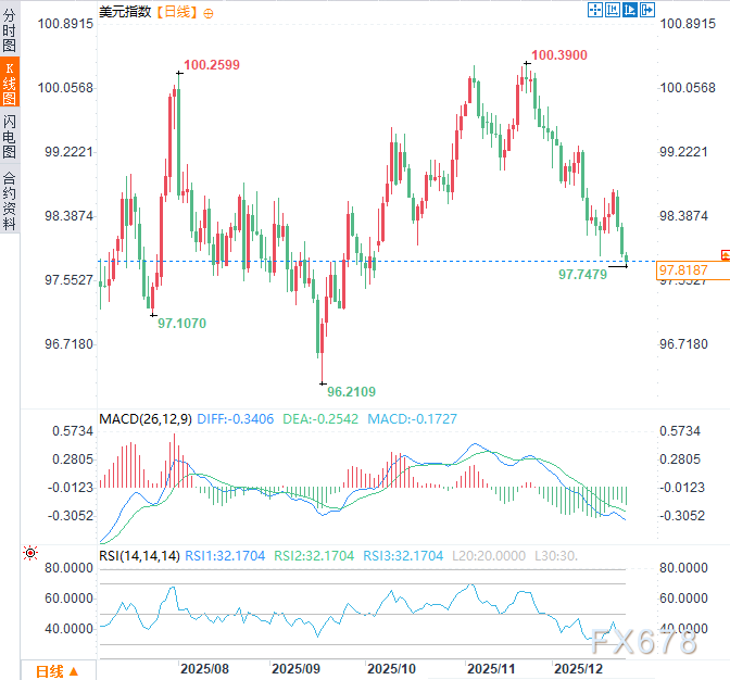 汇通财经APP讯——周二(12月23日)美元指数走弱,但并未出现大幅崩盘。价格早盘下探至97.852,随后在节前交投清淡的市场中,于关键支撑位上方获得买盘支撑并反弹。市场流动性不均,价格反应被放大,交...