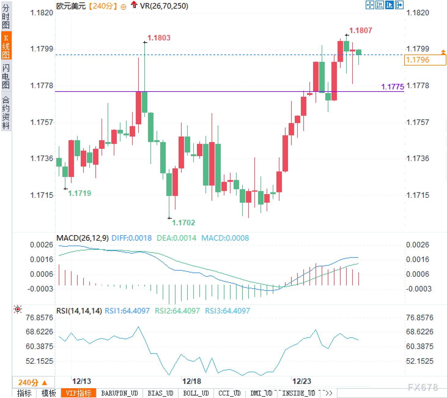 汇通财经APP讯——周三(12月24日)欧洲时段,欧元兑美元在1.1800附近运行,早些时候触及1.1807的高位。临近圣诞假期,市场流动性偏低,汇价在前期涨幅之后转入高位盘整,短线方向更多由利率预期与情绪定价主导。