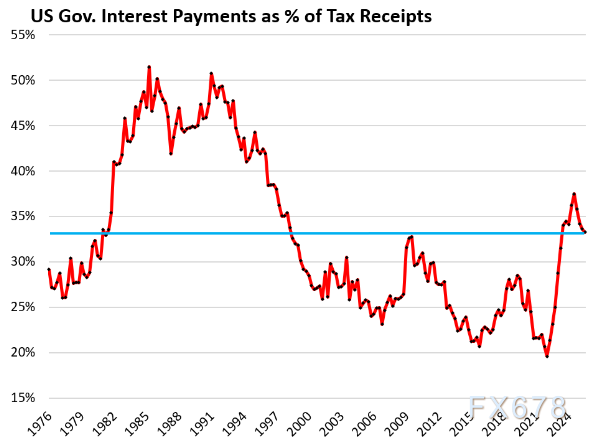 汇通财经APP讯——上世纪美国80年代初上一轮财政危机的峰值阶段,利息支出占税收收入的比例一度突破50%,这一数字足以令人心惊。彼时危机爆发的根源在于,十年期美债收益率连续六年站稳10%上方,甚至一度冲破15%;与此同时,30年期固定抵押贷款的平均利率连续十二年维持在10%以上,峰值更是飙至18%。