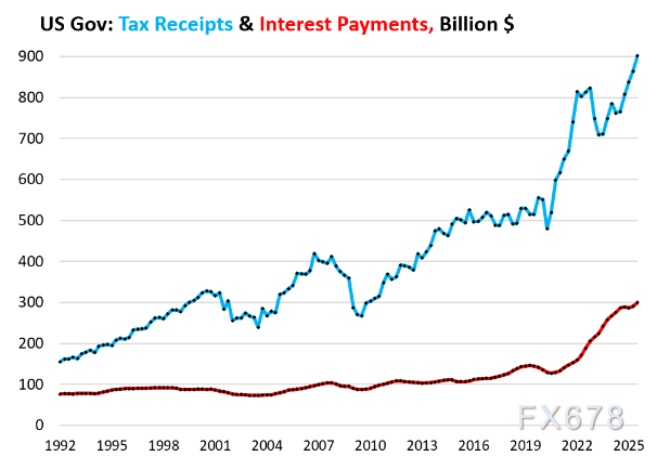 大国政府天量债务对于财政的核心痛点之一在于:天量债务带来的巨额利息支出,会蚕食很多的税收收入,影响政府投资、购买和再分配,使政府心有余而力不足,甚至出现债务攀升、导致国债收益率补偿上升,最后使债务利息继续变多的恶性循环。