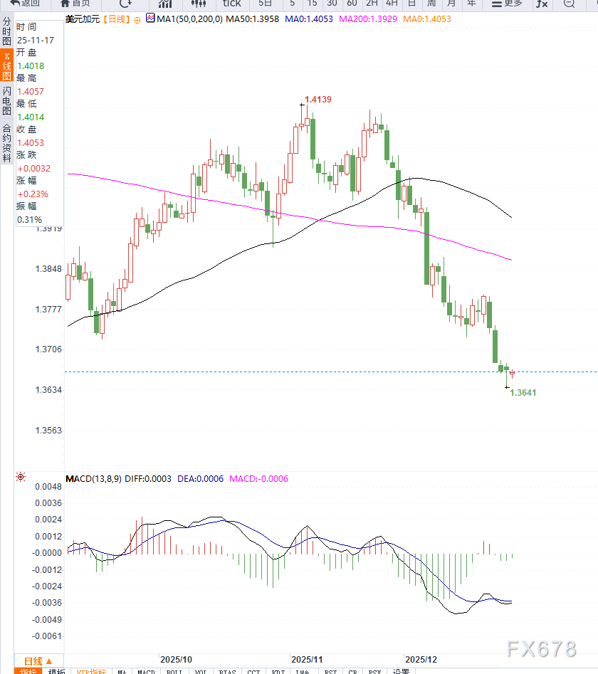 汇通财经APP讯——周一亚洲时段,美元兑加元(USD/CAD)延续跌势,汇价回落至1.3660附近,逼近12月26日触及的五个月低点1.3642。
