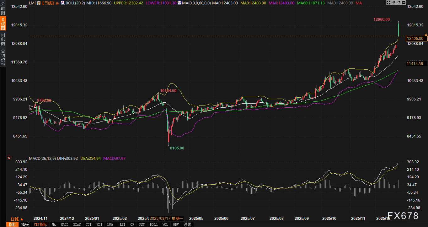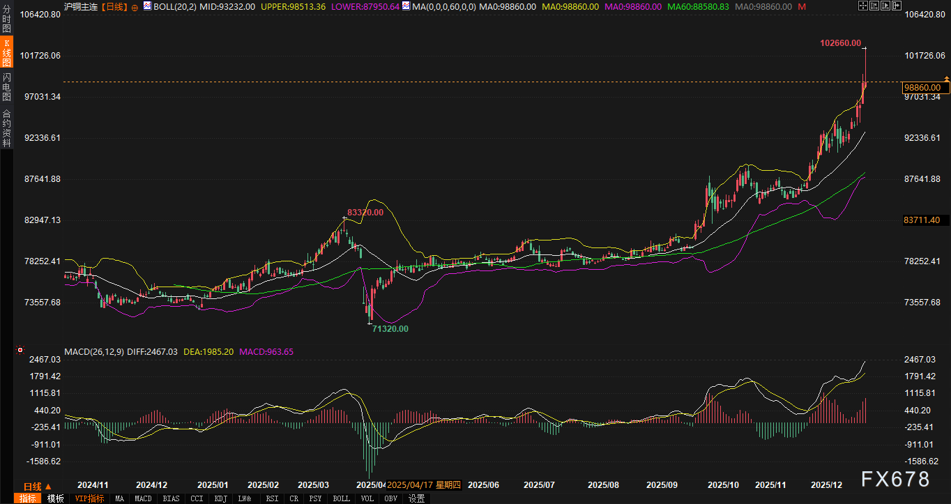 汇通财经APP讯——周一(12月29日),全球主要铜市场延续强势格局,但内、外盘呈现明显分化。截至发稿,伦敦金属交易所(LME)三个月期铜价格高企于12402.50美元/吨,日内涨幅达2.22%;而中国市场的沪铜主力合约报价为98860.00元/吨,日内涨幅为0.76%。这种价差表现和动态的差异化,正精确反映着当前全球铜市场复杂交织的宏观叙事与区域基本面。回顾全年,铜价涨幅已超过30%,并在本月突破了每吨12000美元的历史性关口,创下自2009年以来的最大年度涨幅。市场正在从单边上涨的亢奋中沉淀下来,转而审视未来一季度的价格逻辑与潜在波动。