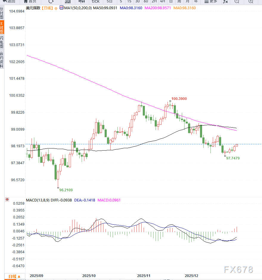 汇通财经APP讯——周二(12月30日)亚洲交易时段,衡量美元兑六大主流货币的美元指数(DXY)保持震荡企稳态势,交投于98.00关键心理关口附近,FOMC12月会议纪要公布前,交易员普遍采取谨慎观望...