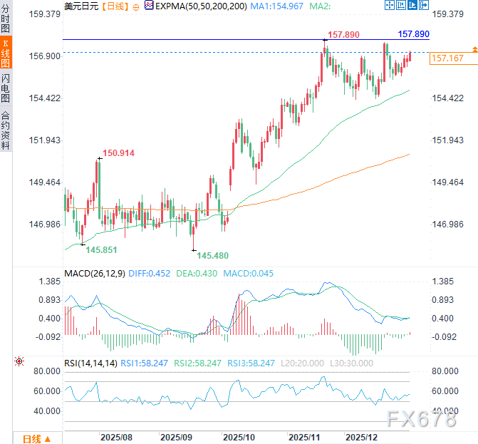 汇通财经APP讯——周一(1月5日)亚市时段,美元兑日元温和上涨,涨幅约0.24%,交投于157.20附近。上周末美国挑动地缘政治紧张局势,扣押委内瑞拉总统尼古拉斯·马杜罗,影响了避险美元需求,预计可能推动美元/日元短期上行。